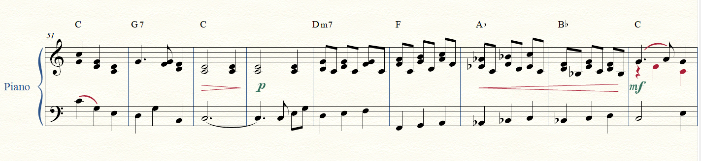 Form and Description: The form of both arrangements is simply three verses. The first is as I described it above. In the second verse, the tenors sing the melody, while, in the piano version, the melody is in the left hand. The chord structure is still not anywhere near the original, but it has a bit more “normalcy” about it.