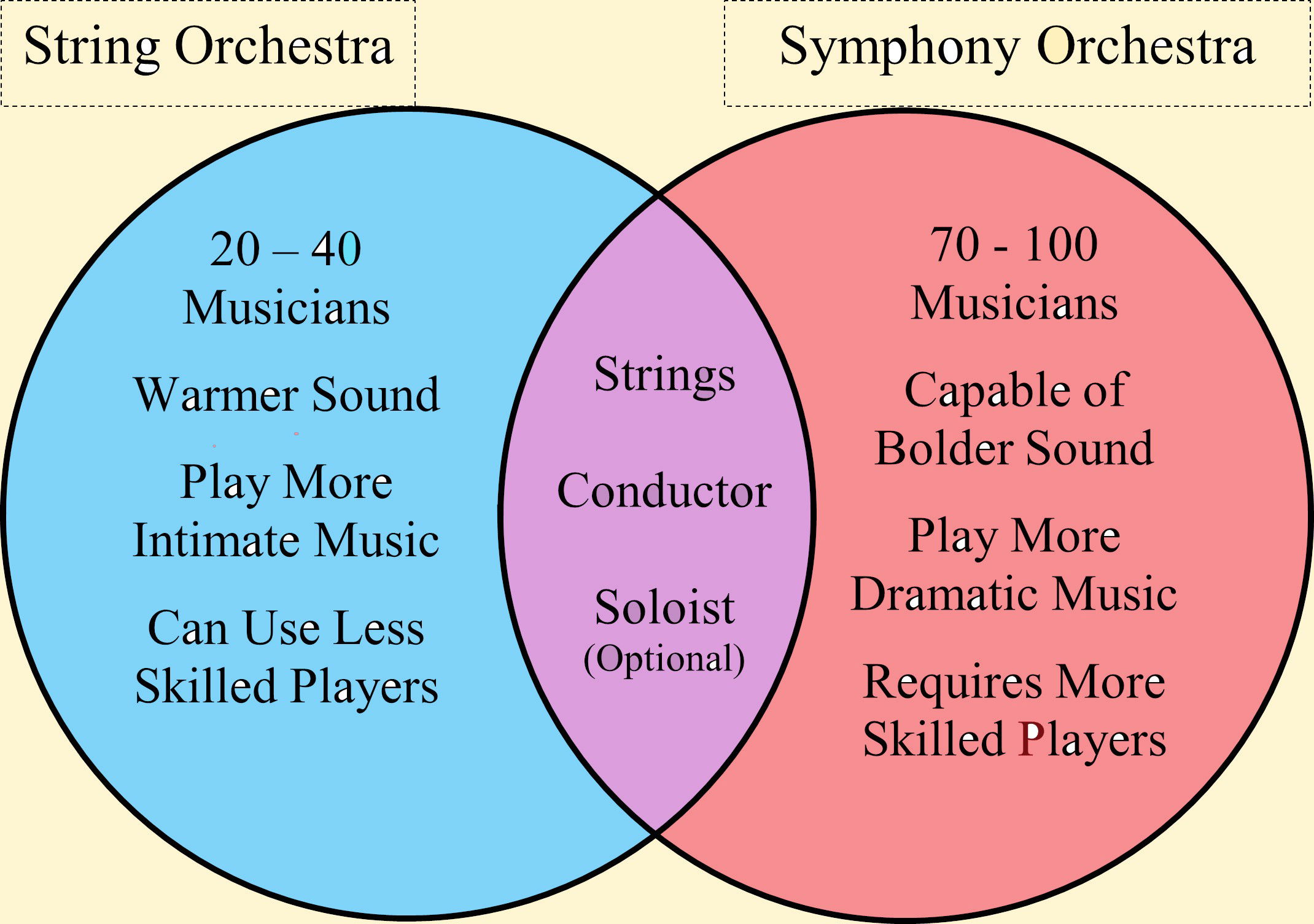 - Music Style – String orchestras often play more intimate sounding pieces such as Baroque or chamber music, while full orchestras perform symphonies, film scores, and large-scale works.